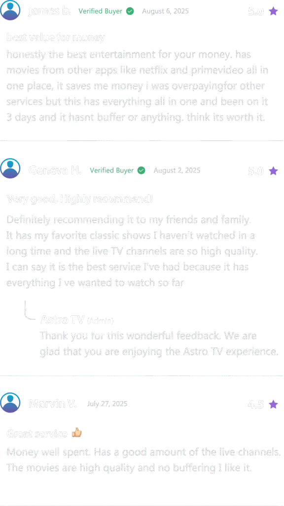 Join thousands of satisfied customers who have switched to Astro TV for a seamless, high-quality TV experience. Discover the freedom and flexibility of cutting the cord, ditching countless subscriptions and enjoying all your favorite channels and shows online at an affordable price!